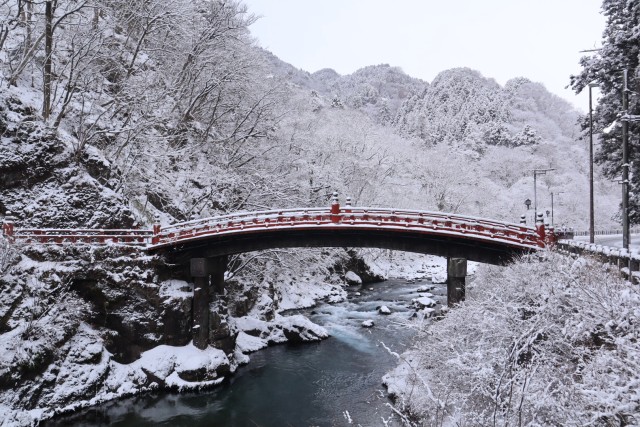 Snow-Covered Mystical Shinkyo BridgeShinkyo Bridge, standing at the entrance to the sacred places of Nikko, enhances the sense of sanctity.
