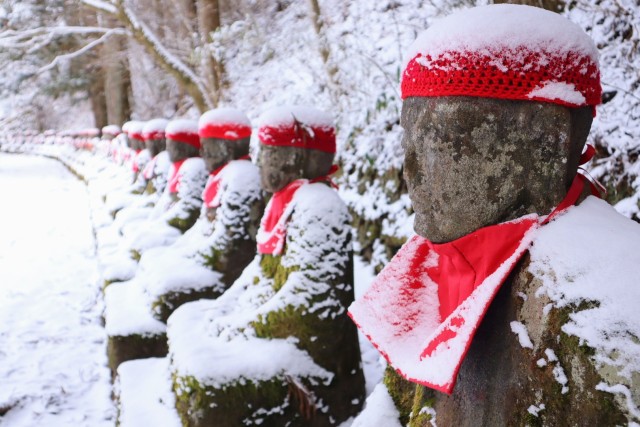 Kanmangafuchi AbyssIt is a stroke of luck to witness the enchanting scene of around 70 Jizo statues wearing caps of snow.