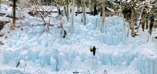 *This ice waterfall can be viewed from the lobby. Please note that this photo shows ongoing maintenance. For safety and preservation, climbing the ice is strictly prohibited. -