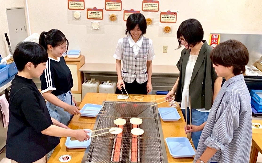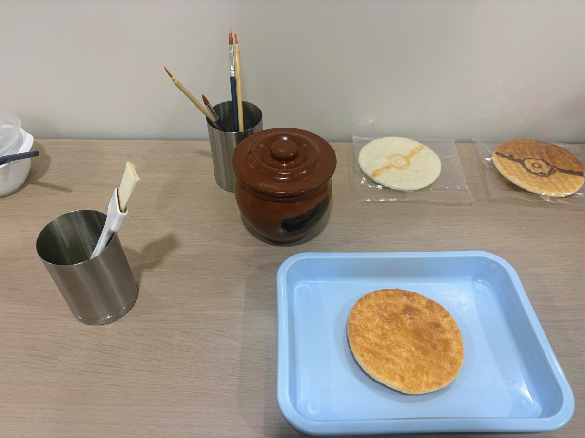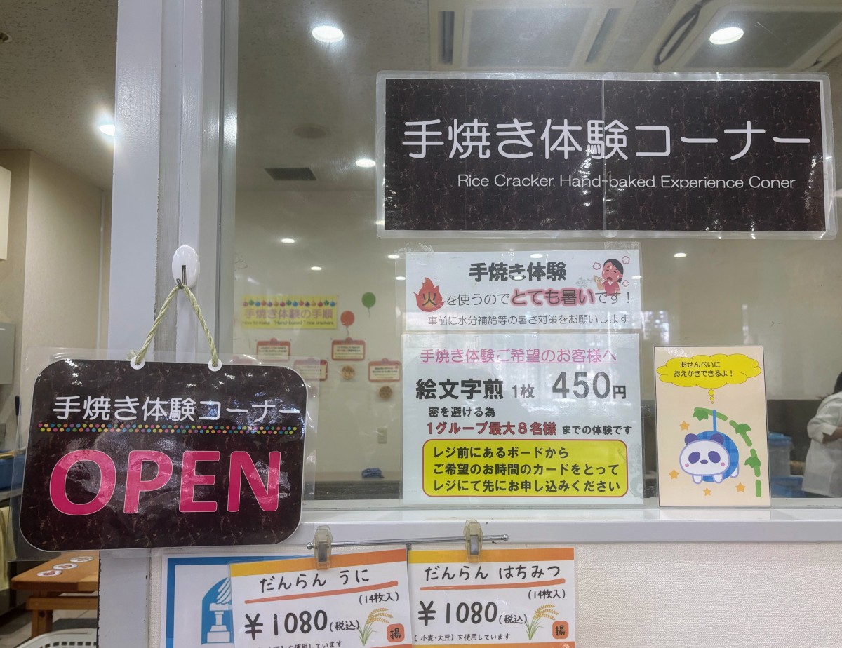 おかきの最終工程を窓越しに見学できるスペースや、焼きたてならではのおいしさを味わえる体験コーナーもあります。手焼き体験は当日受付のみで、1グループ8名までご参加いただけます。せんべいの生地に醤油で絵や文字を描くことができ、世界にひとつだけのオリジナルせんべい作りを楽しめます。自分の手でじっくり焼き上げる時間は特別な思い出となり、「何を描こうかな」と考えるひとときは、大人も子どももワクワクが止まりません。焼き上がったせんべいは、オリジナルの特製袋に入れて持ち帰ることができ、日付を書き込めば旅の記念にもなります。