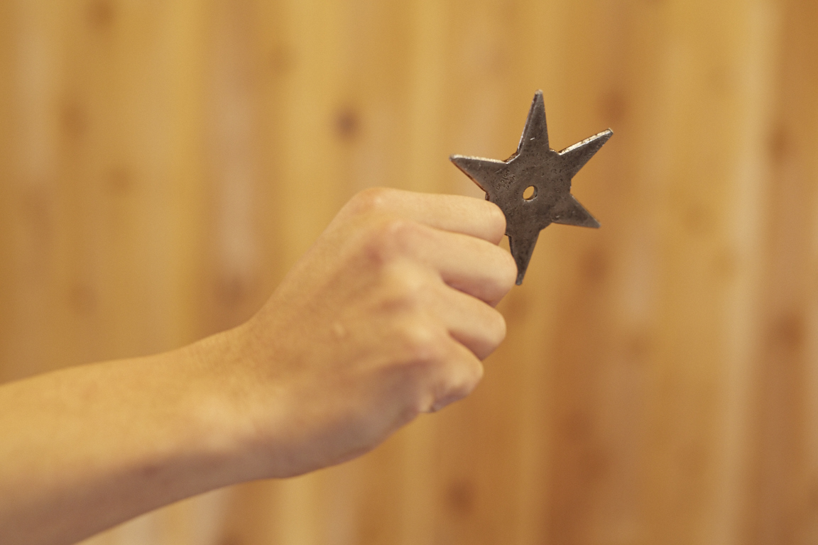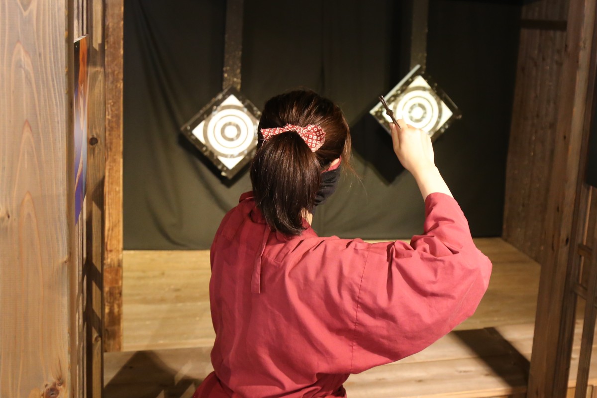 手裏剣道場では実際に手裏剣を投げて的を狙う体験(有料)も。思った以上に難しく、大人でもなかなか刺さりません。子ども向けには距離を短くした的も用意されているため、小さなお子さんでも挑戦しやすく、「刺さった!」という達成感が味わえます。