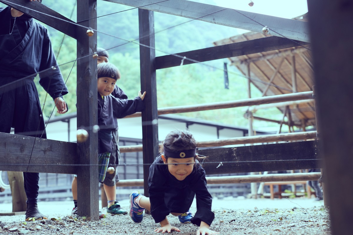 中でも人気なのは「忍者修行体験」。壁歩きや縄抜けなど、体を使ってアスレチック感覚で楽しめる内容です。遊びながら、忍者の基本的な動きを体験できます。スタンプを集めながら進む仕組みになっており、夢中になって取り組めるのも魅力です。親子で一緒に挑戦することで、コミュニケーションも深まります。