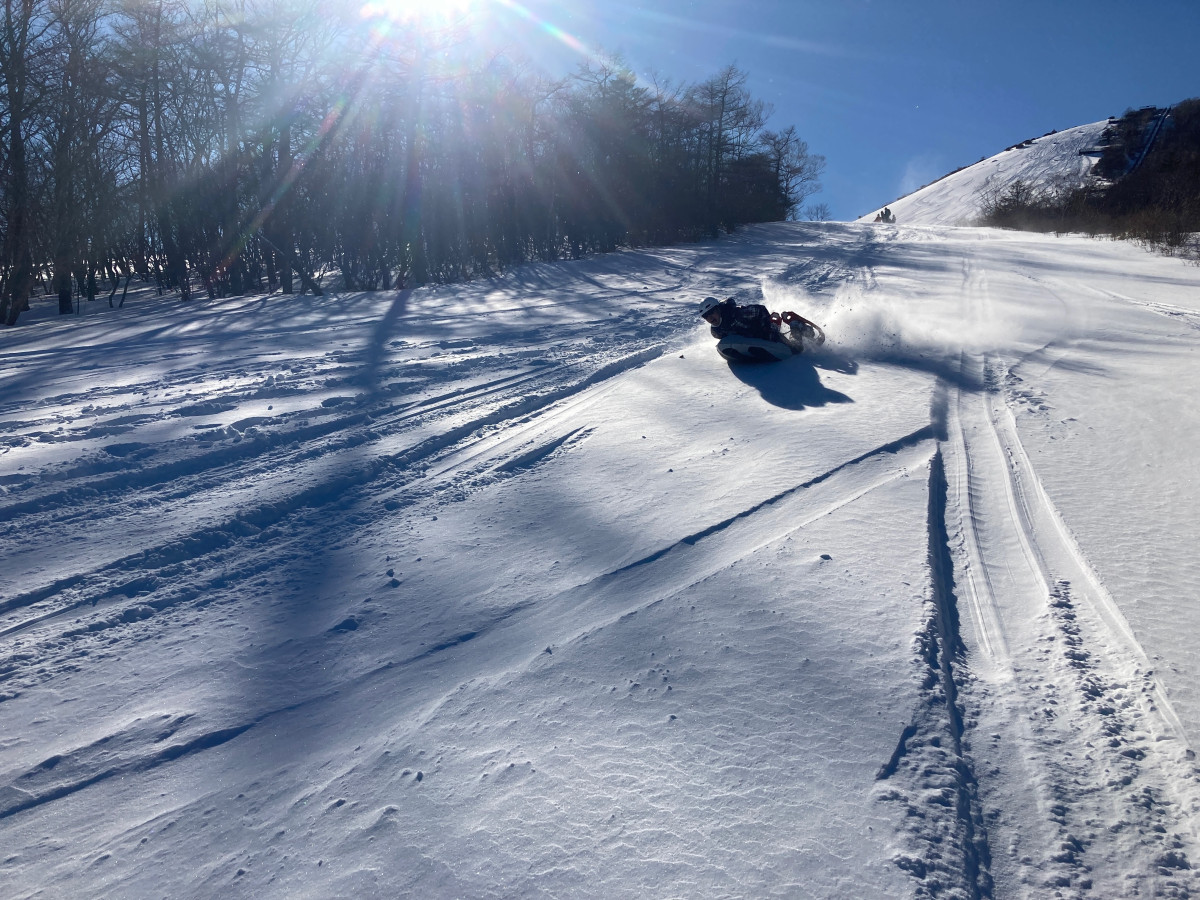 空気で膨らませたソリで、雪の斜面を滑り降りるアクティビティです。うつ伏せなので視線が雪面に近く、普通のソリよりスピード感があります。スノーシューと組み合わせて楽しむことが多い、アクティビティです。