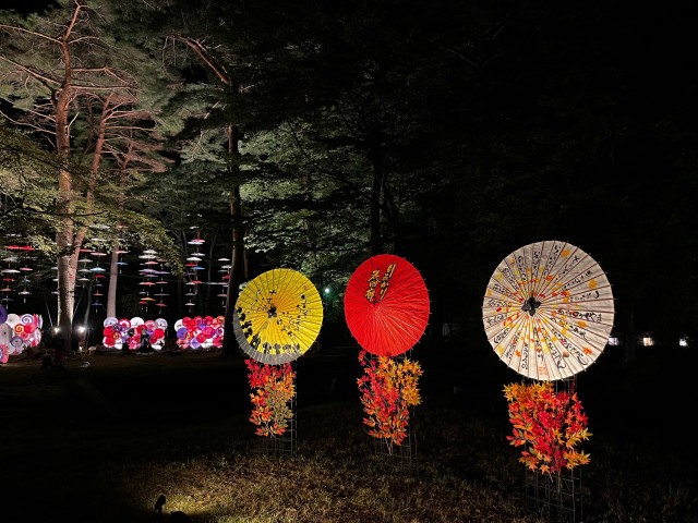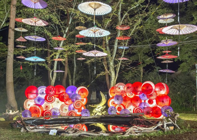 和傘と明かりを使用して「鬼怒川公園」森のエリアを装飾します。