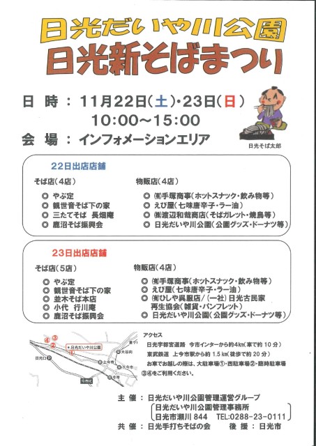 広大な敷地面積をもつ栃木県の県営都市公園「日光だいや川公園」で、秋の新そばまつりが開催されます。