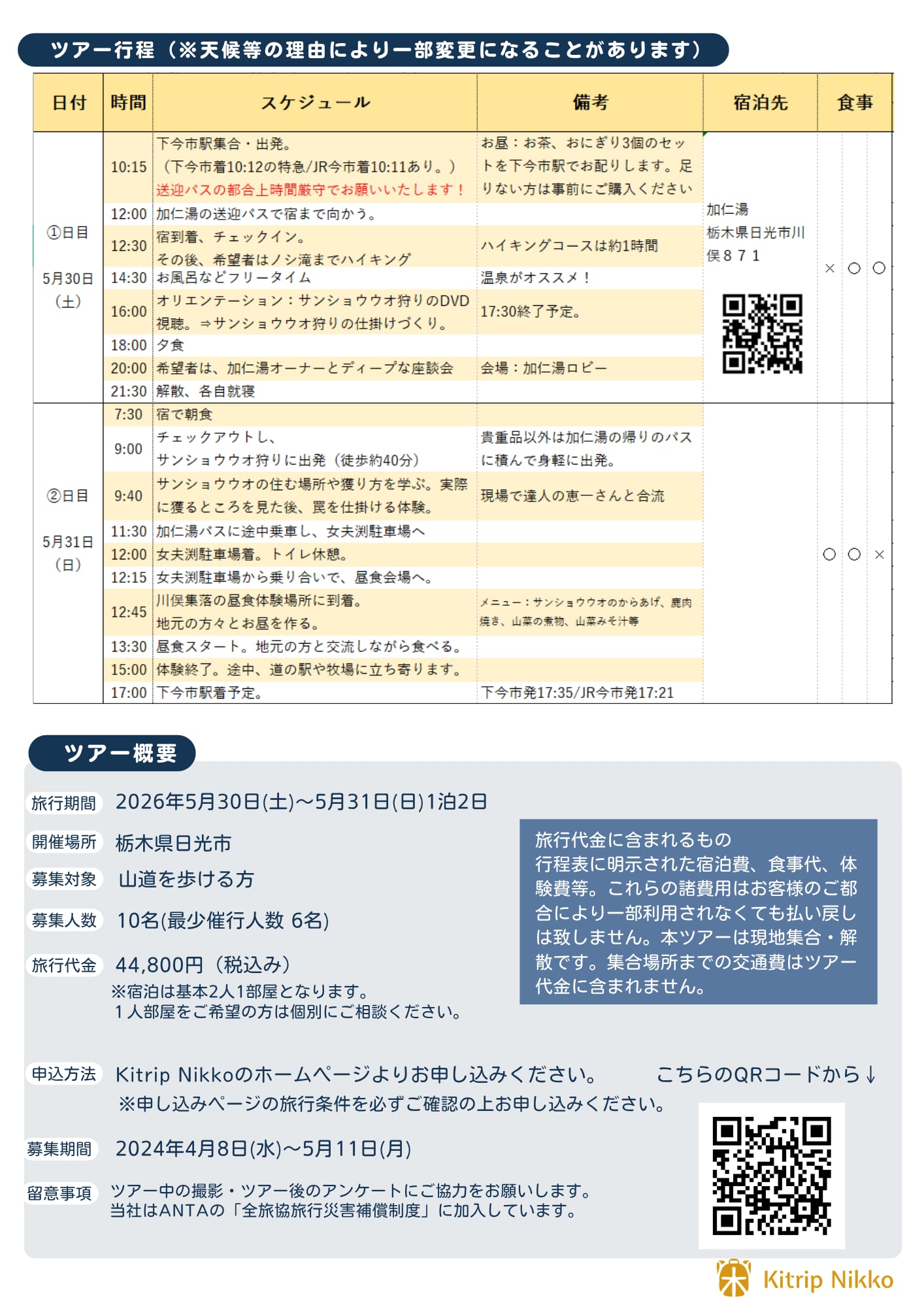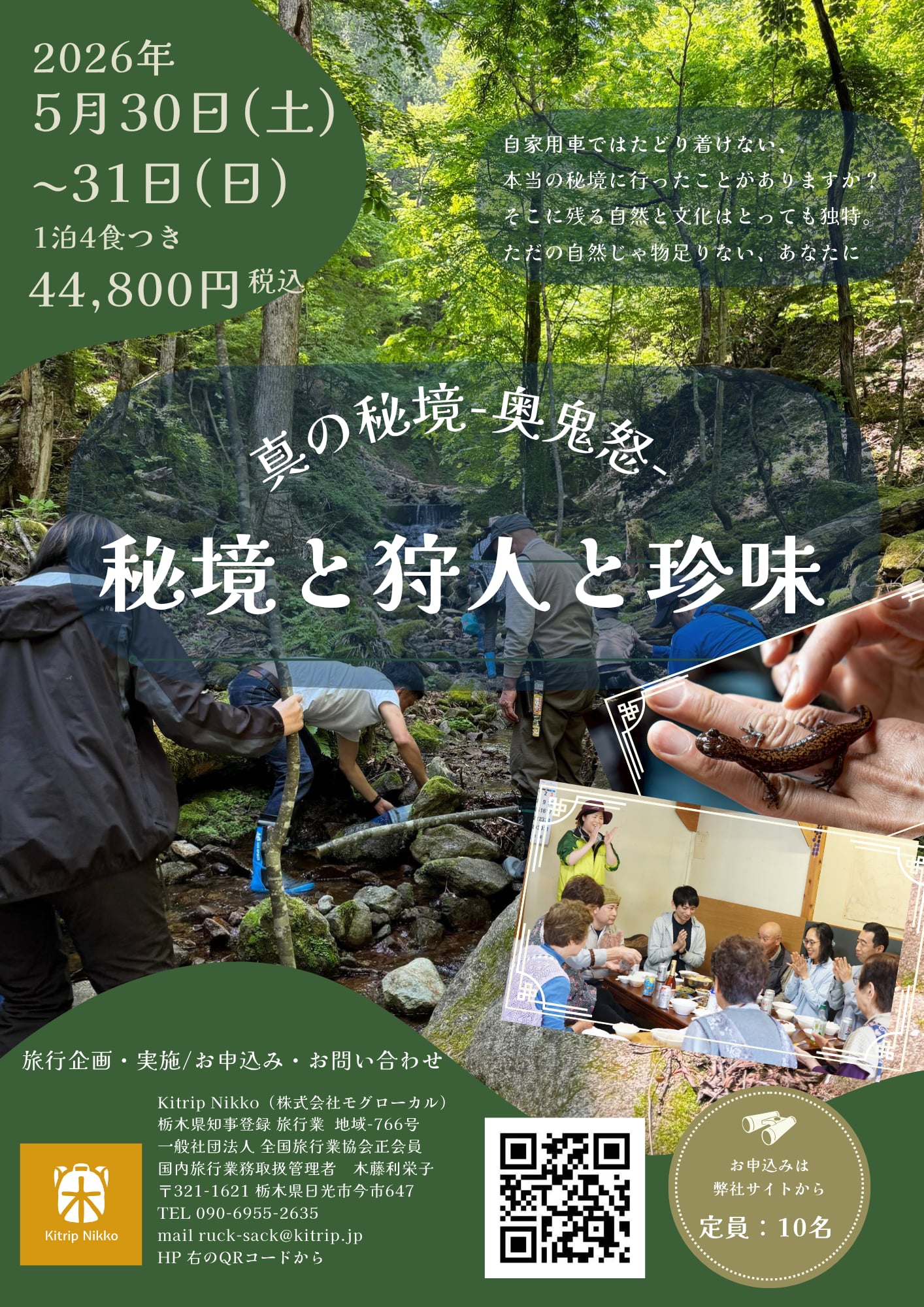 | 問合せ先 | Kitrip Nikko(株式会社モグローカル) 栃木県知事登録旅行業 地域-766号/一般社団法人全国旅行業協会正会員 〒321-1621 栃木県日光市今市647 TEL:090-6955-2635 MAIL:ruck-sack@kitrip.jp |