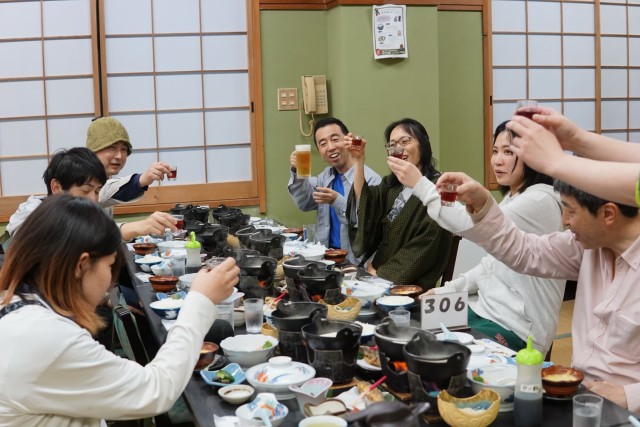〈1日目:加仁湯到着〜秘境の夜〉 下今市駅に集合後、加仁湯の送迎バスで秘境の宿へ。希望者はノシ滝までハイキングも楽しめます。夕方はサンショウウオ狩りのDVD鑑賞と仕掛けづくりで翌日の本番に備え、夜は参加者同士の交流夕食会へ。さらに希望者は加仁湯オーナーとのディープな座談会も。