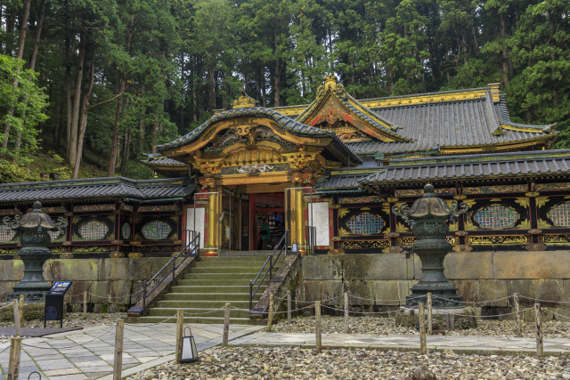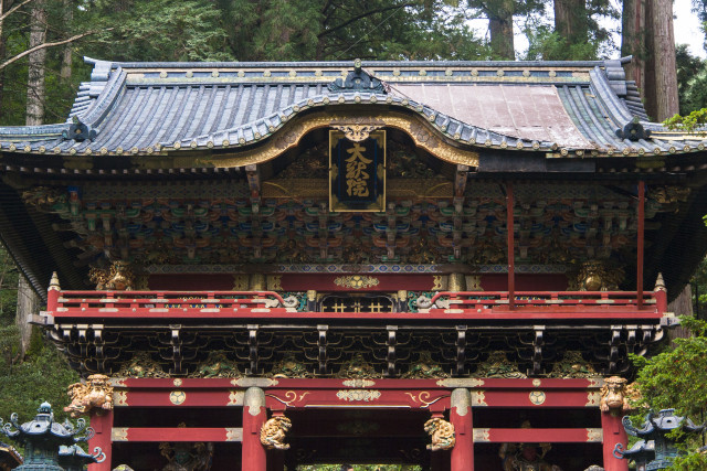 日光山輪王寺にある3代将軍家光の霊廟(れいびょう)で、世界遺産に登録されています。大猷院とは家光の法号のこと。祖父である家康を心から深く尊敬していた家光の、死後も家康に仕えるという遺言により、4代将軍家綱によって建造されました。日光東照宮に比べて規模が小さく華やかさは抑えられていますが、建物は本殿、相の間、拝殿が国宝となっているほか、壮麗な二天門、竜宮城を思わせる皇嘉門(こうかもん)など見どころがたくさんあります。日光東照宮とは異なる趣となっており、目立たない部分に技巧が凝らされているのが特徴です。大猷院の建物は日光東照宮の方角を向き、見守るように建っており、家康への敬愛が感じられます。