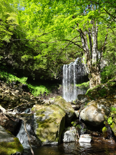 霧降隠れ三滝の一つ。霧降川の支流にかかる滝で、昔は昼でも暗い場所であったために名がついたと言われています。また、全国でもめずらしい北向きに流れ落ちる滝となっています。